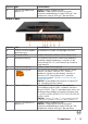 Następująca tabela zawiera opis przycisków na panelu przednim: Przycisk‑ na panelu przednim Opis 1 Przycisk ten umożliwia wybór z listy trybów wstępnych ustawień koloru. Przycisk skrótu: Tryby ustawień wstępnych 2 Użyj tego przycisku do bezpośredniego dostępu do menu “Jasność/Kontrast”. Przycisk skrótu: Jasność/Kontrast 3 Użyj przycisku do uruchomienia menu ekranowego (OSD) oraz wyboru opcji w menu ekranowym. Patrz Dostęp do systemu menu.