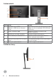 Pohled zezadu Štítek Popis 1 Montážní otvory VESA 100 mm x 100 mm (pod krytem VESA) Použití Připevněte monitor na stěnu pomocí sady držáku na stěnu standardu VESA (100 mm x 100 mm). Obsahuje přehled schválení podle úředních vyhlášek. Uvolněte stojánek z monitoru. 2 Štítek s úředními údaji 3 Tlačítko pro uvolnění stojánku 4 Otvor zámku pro zabezpečení 5 Čárový kód, výrobní číslo a servisní Viz v případě kontaktu technické podpory štítek společnosti Dell.