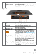 Bảng sau mô tả các nút ở mặt trước: Nút‑mặt trước Mô tả 1 Sử dụng nút này để chọn từ danh sách các chế độ màu cài sẵn. Nút tắt: Chế độ cài sẵn 2 Dùng nút này để truy cập trực tiếp menu “Độ sáng/Độ tương phản”. Nút tắt: Độ sáng/Độ tương phản 3 Dùng nút menu này để bật màn hình ảo (OSD) và chọn menu OSD. Xem Truy cập hệ thống menu. Menu 4 Dùng nút này để trở về menu chính hoặc thoát menu chính OSD. Thoát 5 Nút Nguồn (có đèn báo trạng thái nguồn) 32 | Sử dụng màn hình Để bật hoặc tắt màn hình.