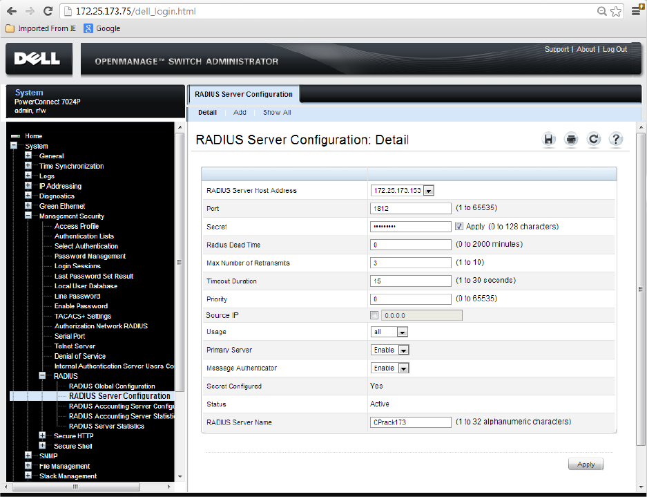 Figure 3. MAC Authentication 7024P Switch - RADIUS Server Configuration