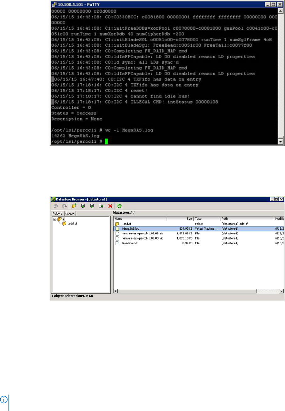 8. Copiez MegaSAS.log dans la mémoire de données en utilisant la commande cp /opt/lsi/perccli/MegaSAS.log /vmfs/