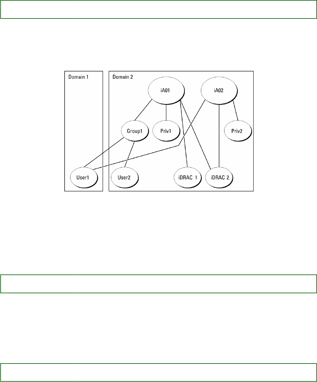有しています。ユーザー 2 は iDRAC1 と iDRAC2 の両方に対して Priv1 権限を所有しています。さらに、この図は、ユーザー 1 が異