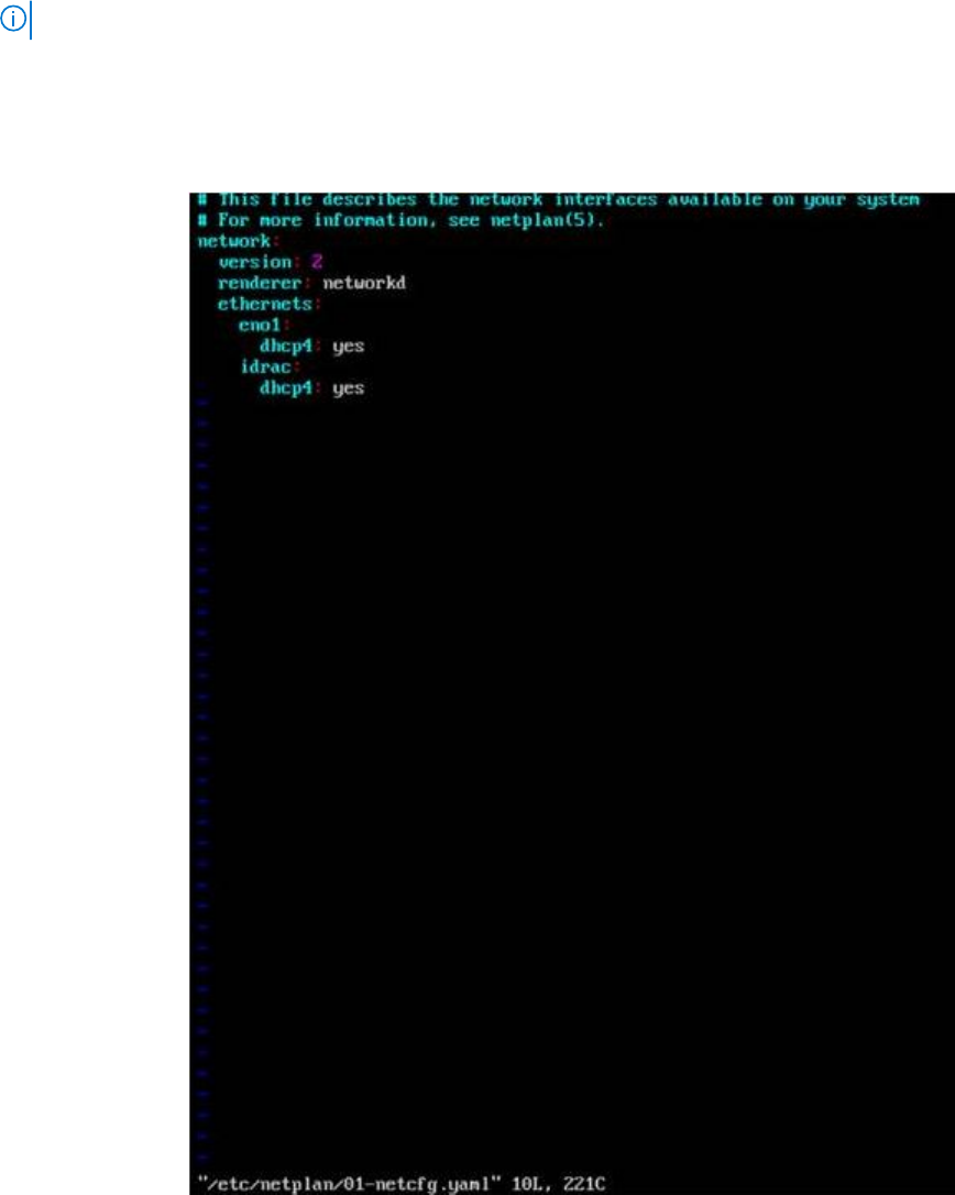 Ubuntu では、Netplan ユーティリティーを使用して iDRAC インターフェイスを DHCP モードに設定します。DHCP を設定するに
