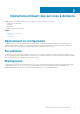 2 Opérations utilisant des services à distance À l'aide de Lifecycle Controller-Remote Services, vous pouvez effectuer les opérations suivantes : • • • • Déploiement et configuration Surveillance Maintenance Création et planification de tâches Sujets : • • • Déploiement et configuration Surveillance Maintenance Déploiement et configuration Les différentes fonctions des services à distance Lifecycle Controller vous permettent d’effectuer différentes configurations sur un système tout au long de son cycle