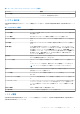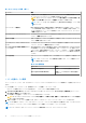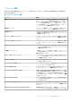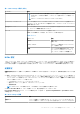 表 19. System Security の詳細 オプション 説明 CPU AES-NI Advanced Encryption Standard Instruction Set(AES-NI)を使用して暗号化および復号を行 うことによって、アプリケーションのスピードを向上させます。このオプションは、デフ ォルトで有効に設定されています。 System Password システムパスワードを設定します。このオプションは、デフォルトで 有効に設定されてお り、システムにパスワードジャンパが取り付けられていない場合は、読み取り専用になり ます。 Setup Password セットアップパスワードを設定します。システムにパスワード ジャンパーが取り付けられ ていない場合、このオプションは読み取り専用です。 Password Status システムパスワードをロックします。デフォルトでは、このオプションは ロック解除に設 定されています。 表 20. TPM 1.
