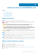 4 Install and remove a Dell HBA355i card Topics: • • • • • • • Safety instructions Before working inside your system After working inside your system Remove the Dell HBA355i adapter Install the Dell HBA355i adapter Remove the Dell HBA355i front card Install the Dell HBA355i front card Safety instructions NOTE: To avoid injury, do not lift the system on your own. Get others to assist you. WARNING: Opening or removing the system cover while the system is turned on may expose you to a risk of electric shock.