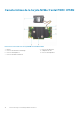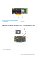 NOTA: Se recomienda utilizar siempre una alfombrilla y una muñequera antiestáticas al manipular los componentes del interior del sistema. Pasos 1. Apague el sistema, incluidos los periféricos conectados, y desconéctelo de la toma de corriente y de los periféricos. 2. Abra el sistema. 3. Ubique la tarjeta PERC en el portaunidades de la controladora en la parte frontal del sistema. PRECAUCIÓN: Para evitar que se produzcan daños en la tarjeta, debe sujetar la tarjeta por los bordes. 4.