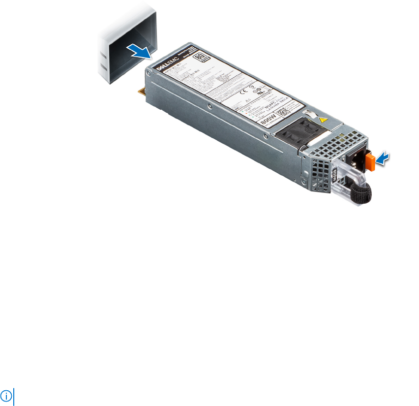 Faites glisser le bloc d’alimentation dans la baie de bloc d’alimentation jusqu’à ce que le loquet de déverrouillage s’enclenche.