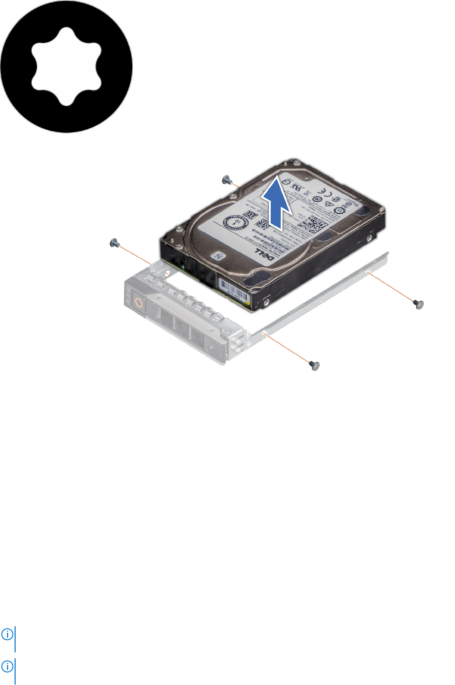 REMARQUE : Si le support de disque dur ou SSD est doté d’une vis Torx, utilisez un tournevis Torx 6 (pour le disque 2,5 pouces)