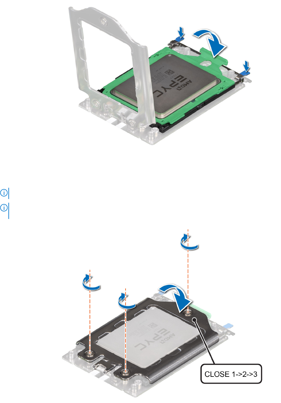 REMARQUE : Appuyez sur la plaque de pression lorsque vous serrez les vis afin d’éviter de faire basculer le capot du processeur