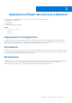 2 Opérations utilisant des services à distance À l'aide de Lifecycle Controller-Remote Services, vous pouvez effectuer les opérations suivantes : ● Déploiement et configuration ● Surveillance ● Maintenance ● Création et planification de tâches Sujets : • • • Déploiement et configuration Surveillance Maintenance Déploiement et configuration Les différentes fonctions des services à distance Lifecycle Controller vous permettent d’effectuer différentes configurations sur un système tout au long de son cycle