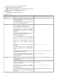표 13. PSA/ePSA 오류 코드 (계속) 오류 번호(PSA 및 ePSA) 오류 메시지 설명 단계 4. 장애가 지속되면 Dell 기술 지원에 문의하십시오. PSA NA ePSA 2000-8158 PSA NA ePSA 2000-8160 PSA NA ePSA 2000-8165 PSA NA 백플레인 - [DRIVE] 드라이브 [d] - 잘못된 상태 = [x], [s] PERC - PERC 배터리 [d] - 잘못 [s] 문자열은 다음 메시지 중 하 된 상태 = [x], [s] 나일 수 있습니다. ● 누락되거나 연결이 끊긴 배 터리 ● 배터리 팩 교체 ● 남은 용량 낮음 ePSA 2000-8170 PSA NA ePSA 2000-8415 PSA NA ePSA 2000-8611 32 진단 실행 1. 드라이브/케이블/연결을 다시 장착합니다. 2. PSA 진단을 반복합니다. 3. 장애가 지속되면 Dell 기술 지원에 문의하십시오. 1. 부품을 다시 장착합니다. 2.