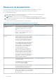 Tableau 13. Codes d’erreur PSA/ePSA (suite) Numéro d'erreur (PSA et ePSA) Message d'erreur Description PSA S/O Mémoire vidéo : écart dans le test d’intégrité de la mémoire vidéo Les diagnostics PSA ont détecté 1. Mettez à jour la version du une défaillance de la mémoire BIOS. vidéo. Veuillez réinitialiser la 2. Réinitialisez la mémoire mémoire système et mettre à système. jour le BIOS vers la dernière 3. Mettez l'ordinateur hors version. tension et rebranchez le câble LCD. 4.