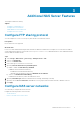 3 Additional NAS Server Features This chapter includes the following. Topics: • • • • Configure FTP sharing protocol Configure NAS server networks Enable NDMP Protection and Events Configure NAS server Security Configure FTP sharing protocol You can configure FTP or FTP over SSH (SFTP) after the NAS server has been created. Prerequisites Passive mode FTP is not supported. About this task FTP access can be authenticated using the same methods as SMB.