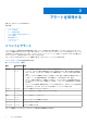 表 2. その他のアラート属性 属性 適用される対 説明 象 エラー コー ド アラート アラートに関連づけられたエラー コード。トラブルシューティング情報を検索するには、このコ ードを使用します。 Respond アラート アラートを確認済みまたは未確認としてマークします。受信確認済みのアラートはデフォルトで は表示されません。 Repair Flow アラート この状況を解決するための推奨手順。一部のアクションはアラート ウィンドウから直接実行でき ます。 通知 アラート アラートが E メール通知をトリガーしたかどうか。 Service and Support アラート サポートおよびトラブルシューティング リソースへのリンク。 Associated Events アラート アラートに関連するイベント。 イベントとアラートを表示するときは、発生日時、オブジェクト タイプ、および説明でフィルター処理できます。アラートを.