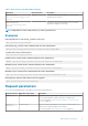Name Description data_network _latency Network latency for the PowerStore remote system. optional description User-specified description of the remote system. optional Maximal length : 256 Schema RemoteSystemLaten cyEnum string management_ address Management IP address of the remote system. string (ip-address) optional User-specified name of the remote system. Used only for name non-PowerStore type remote systems. This value must optional contain 128 or fewer printable Unicode characters.