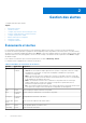2 Gestion des alertes Ce chapitre traite des sujets suivants : Sujets : • • • • • • • • Événements et alertes Surveiller les alertes Configurer les préférences de notification par e-mail Désactiver temporairement les notifications d’alerte Configurer les paramètres SNMP Bannière d’informations stratégiques Vérifications système Consignation à distance Événements et alertes Les événements fournissent des informations sur les modifications apportées au système.