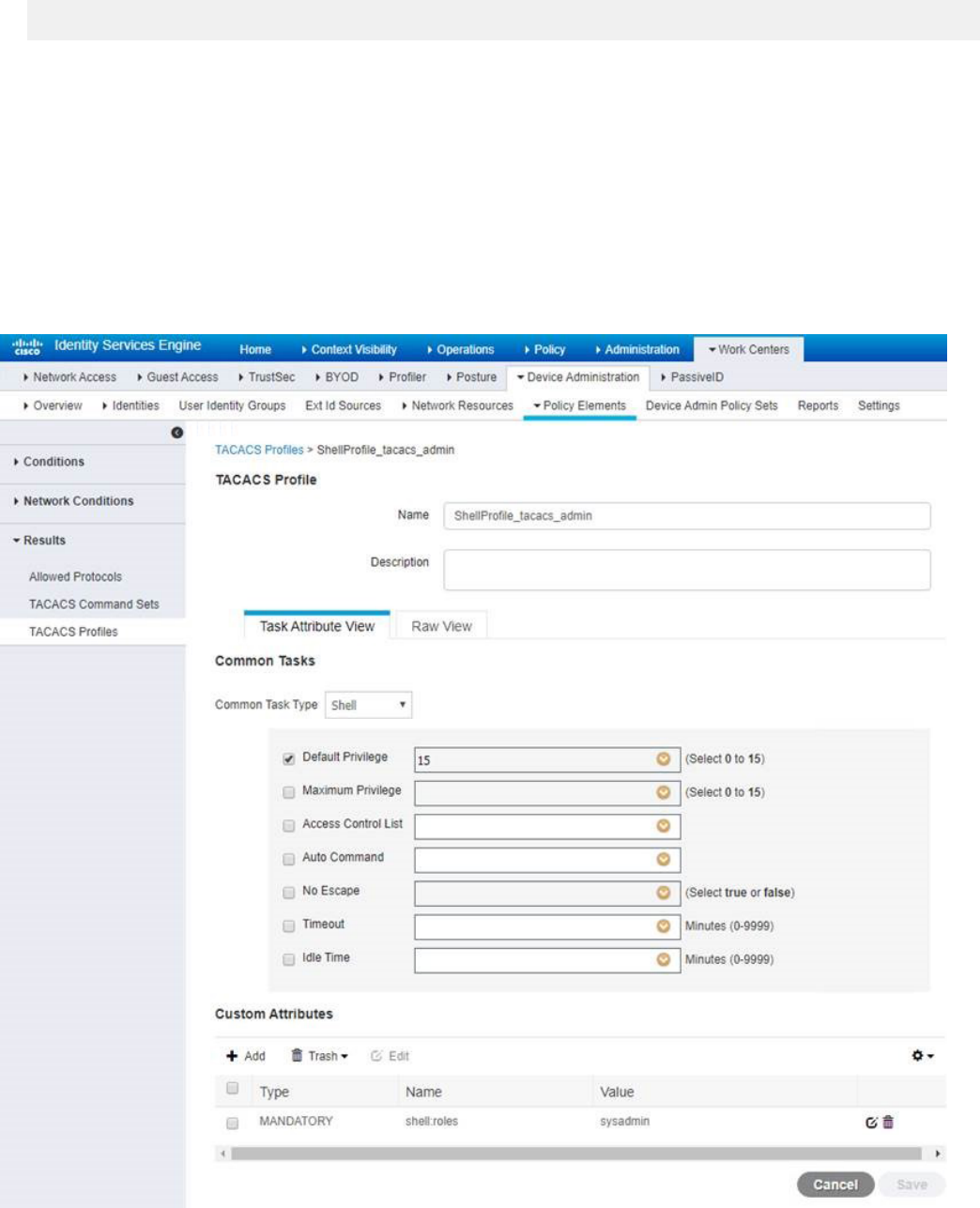 15 as privilege level on the TACACS+ Server. The following figure shows the Cisco ISE TACACS server configuration: