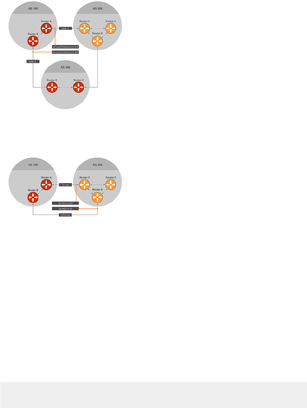 the MED for its Link 1 exit point to 100 and the MED for its Link 2 exit point to 50. This sets up a path preference through Link