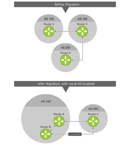 immediately updating Router C’s configuration. Local-AS allows Router B to appear as if it still belongs to Router B’s old