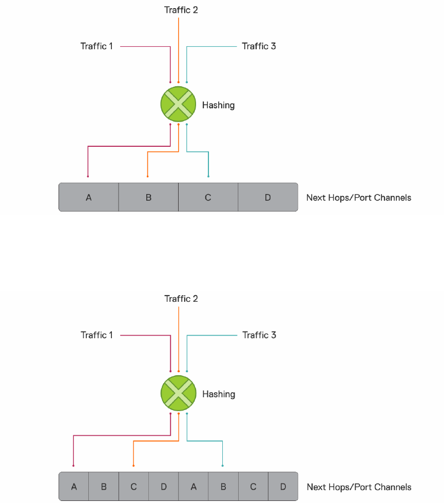 number of ECMP paths) and traffic is equally distributed. In the following example, traffic 1 maps to next hop 'A'; traffic 2 maps