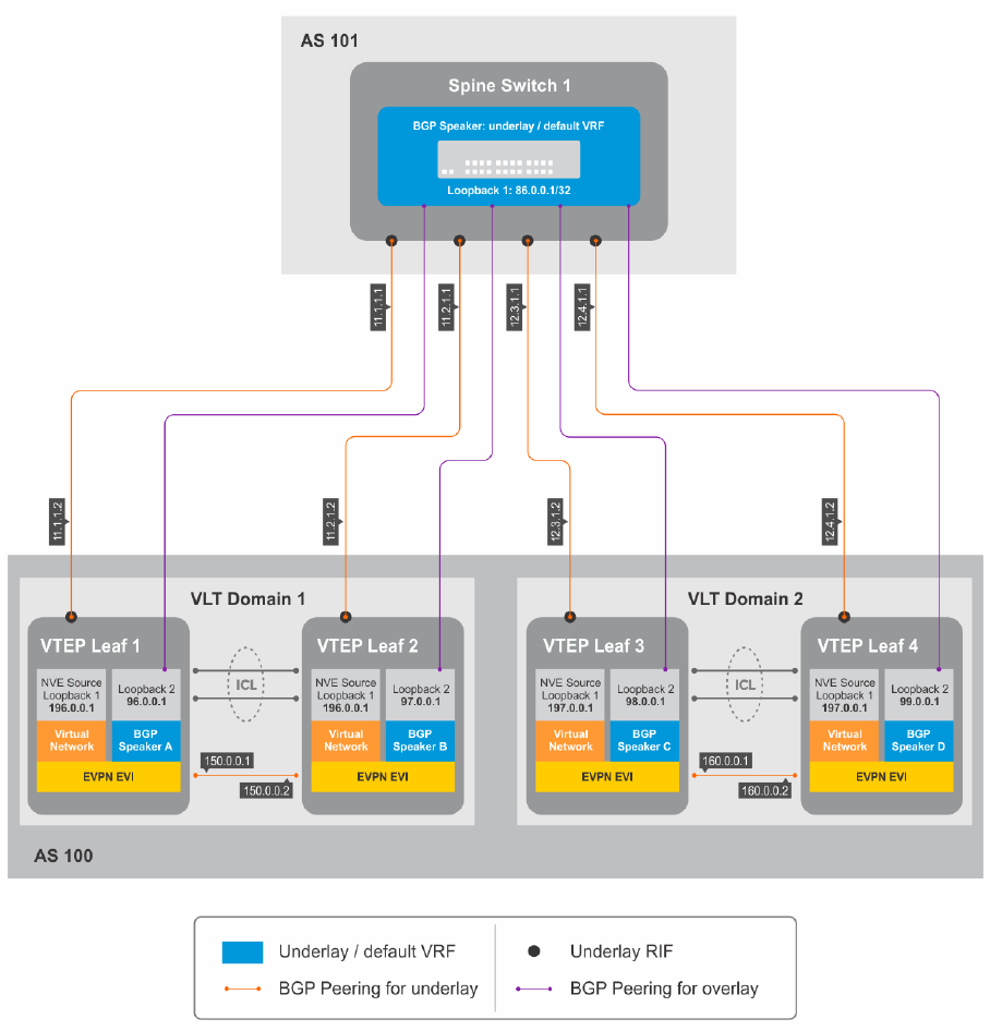 Both VTEPs in a VLT pair advertise identical EVPN routes, which provides redundancy if one of the VTEP peers fails. To set up