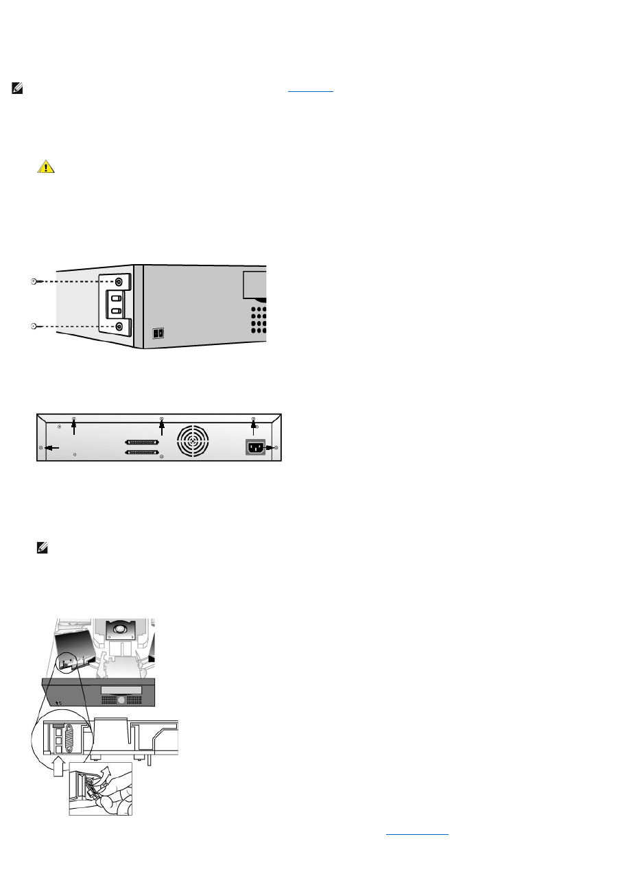 警告: 負傷を防ぐために、電源ケーブルと SCSI ケーブルを切断してからオートローダのカバーを外し、ファンには指を近づけないようにしてくださ