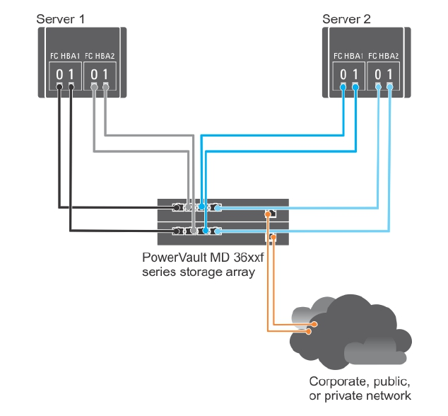 Figure 5. Two Host Servers With Two Dual-Port HBAs Connected to a Dual-Controller (Duplex) Storage Array