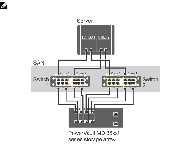 Figure 1. Example of Switch Zoning on SAN on an MD3600f-series Fibre-Channel Storage Array