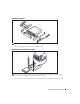 電源ケーブルの接続 両方の電源ケーブルを電源装置 / 冷却ファンモジュールに接続します。 電源コード固定ブラケットの取り付け ブラケットの背面の留め金を電源ループの上部に、中央の留め金をループの垂直方向の中間 に取り付けることで、電源コード固定ブラケットを電源ループに取り付けます。システムの 電源ケーブルをブラケットのケーブル留め金に取り付けます。2 台目の電源装置についても 同じ手順を繰り返します。 電源ケーブルのもう一方の端を、アースされた電源コンセント、または UPS(無停電電源装置)や PDU(電力配分装置)などの別の電源に接続します。 『ハードウェアオーナーズマニュアル』に記載されている手順に従って、RAID コントローラモ ジュールのケーブルを接続します。 36 はじめに