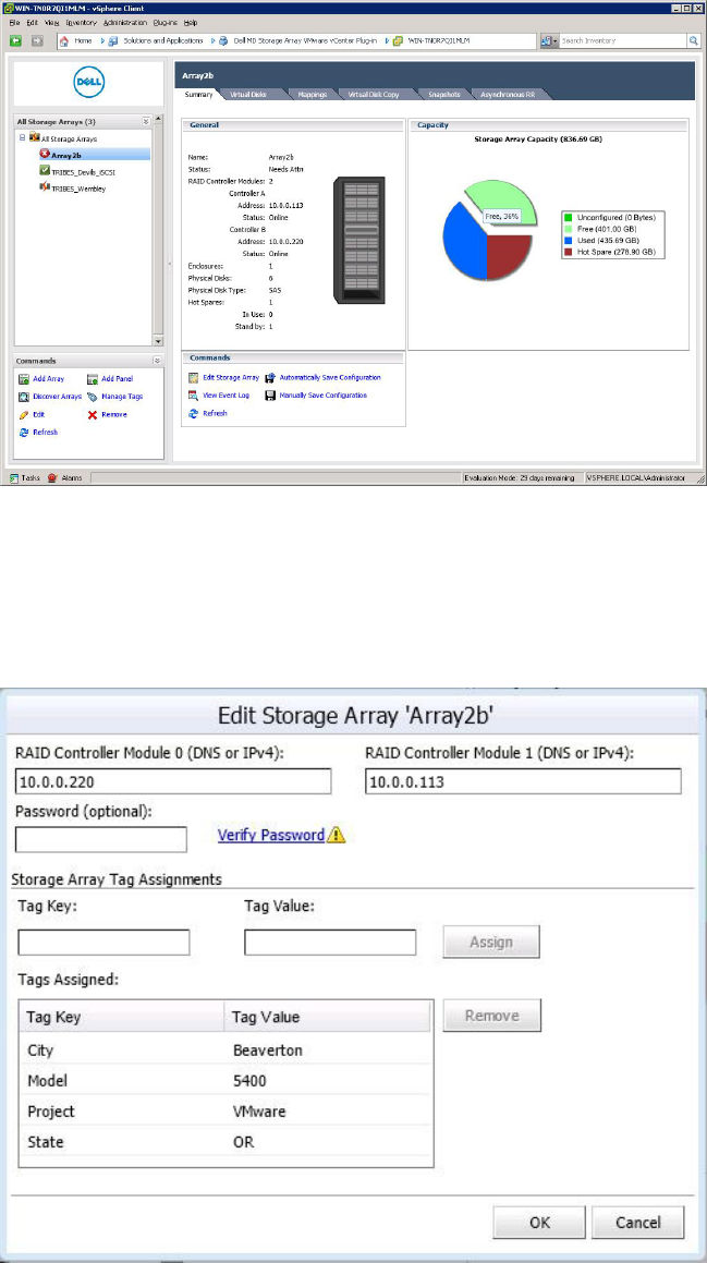コマンド エリアにある ストレージアレイの編集 機能では、選択したストレージアレイのために、ストレー