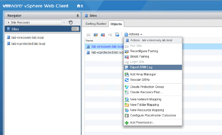 • 両サイトからの SRM システムログのエクスポート