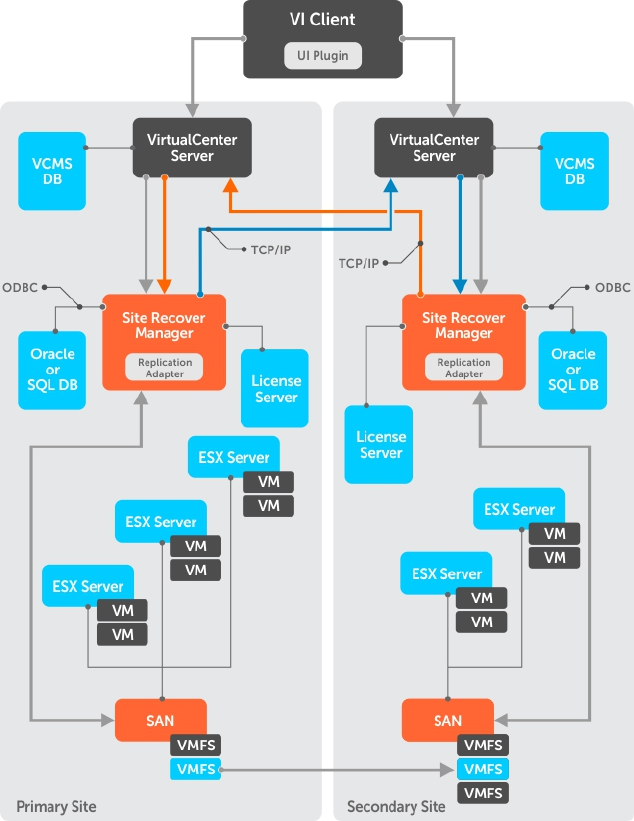 VMware vCenter Site Recovery Manager(SRM)は、災害リカバリ(DR)サイト間でストレージ論理ユニット番号(SRA)、または仮想ディ