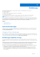 1 Einführung Dieser Abschnitt enthält Informationen zur Bereitstellung von Dell EMC PowerVault MD3860f-Speicher-Arrays. Der Bereitstellungsvorgang umfasst: ● Hardware-Installation ● Installation des MD-Storage-Managers (Modular Disk Storage Manager) ● Erstmalige Systemkonfiguration Andere bereitgestellte Informationen beinhalten Systemanforderungen, Speicher-Array-Organisation und Dienstprogramme. ANMERKUNG: Weitere Informationen zur Produktdokumentation finden Sie in der zugehörigen Dokumentation.