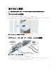 取り付けと設定 警告: 次の手順を実行する前に、システムに付属の安全に関する注意事項をお読みください。 ラックシステムの開梱 システムを箱から取り出し、同梱品がすべて揃っていることを確認します。 レールの組み立てとラックへのシステムの取り付けの際は、システムに付属しているマニュアルの安全にお 使いいただくための注意、およびラックへの取り付け手順に従ってください。 図 1. ラックへのレールとシステムの取り付け オプション — キーボード、マウス、モニタの接続 図 2.