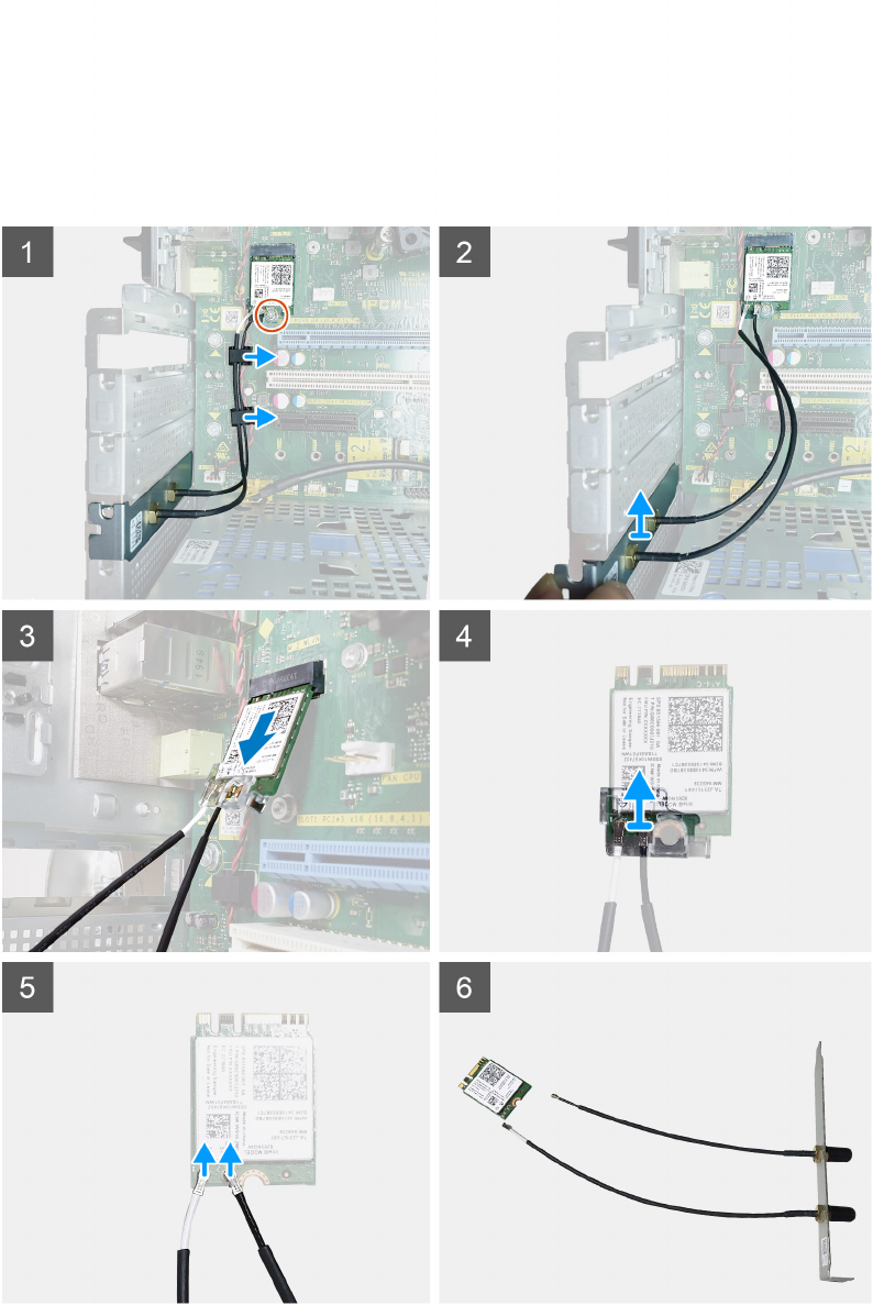 1. Fjern den ene (M2x3.5)-skruen som fester WLAN-kortet til hovedkortet, og omgjør antennekablene fra gummiføringene på