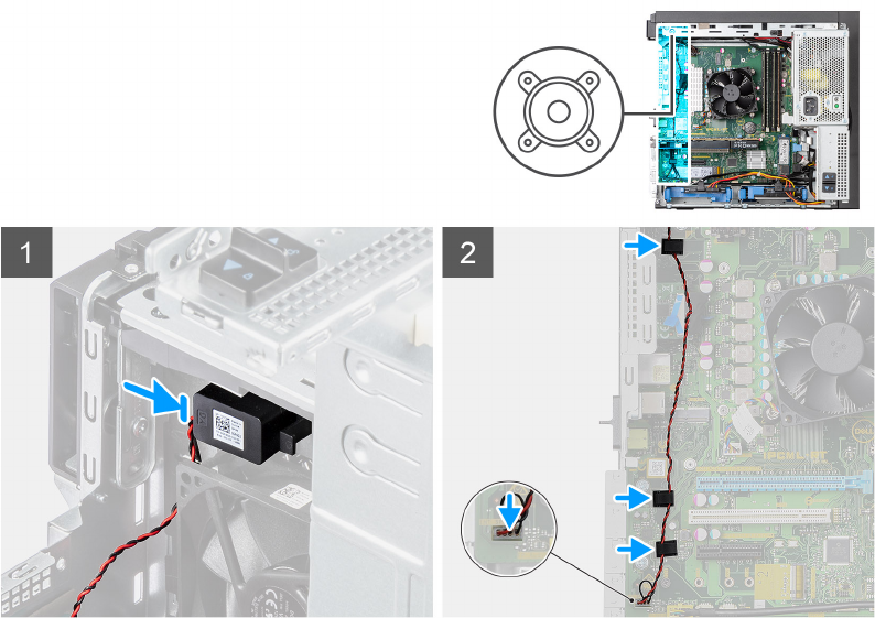 2. Før høyttalerkabelen langs kabelføringen på hovedkortet, og koble høyttalerkabelen til hovedkortet.