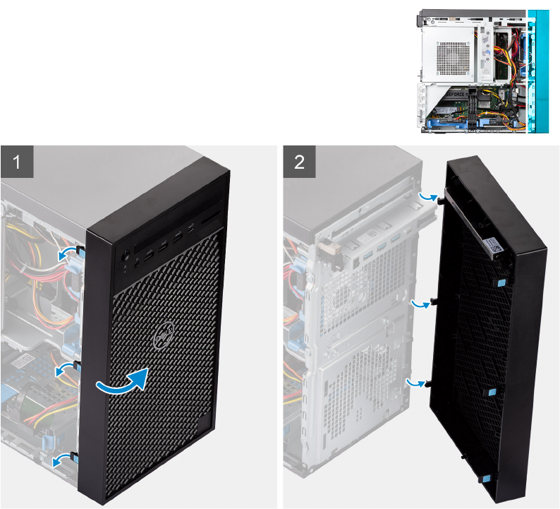 2. Zavrtite in povlecite sprednji okvir, da ga sprostite iz rež na ohišju.