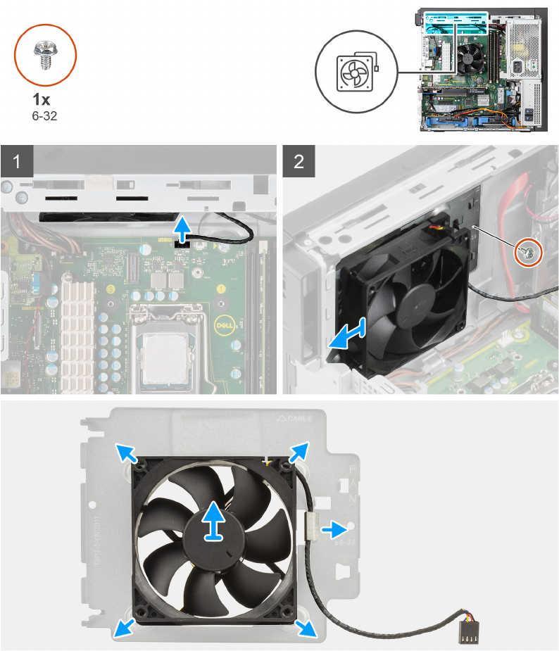 Spodnje slike kažejo, kje je zgornji ventilator, in prikazujejo postopek odstranitve.