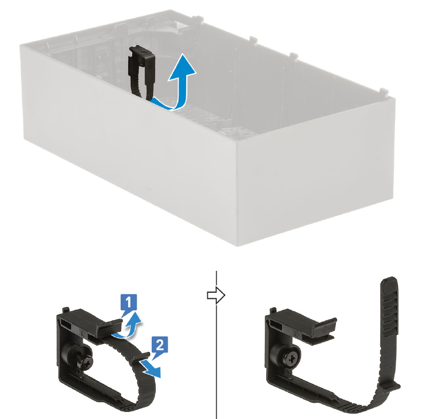 5. Sprostitveni zapah kabla poravnajte z režo na ohišju sistema [1]. Privijte vijak, da sprostitveni zapah kabla pritrdite na ohišje