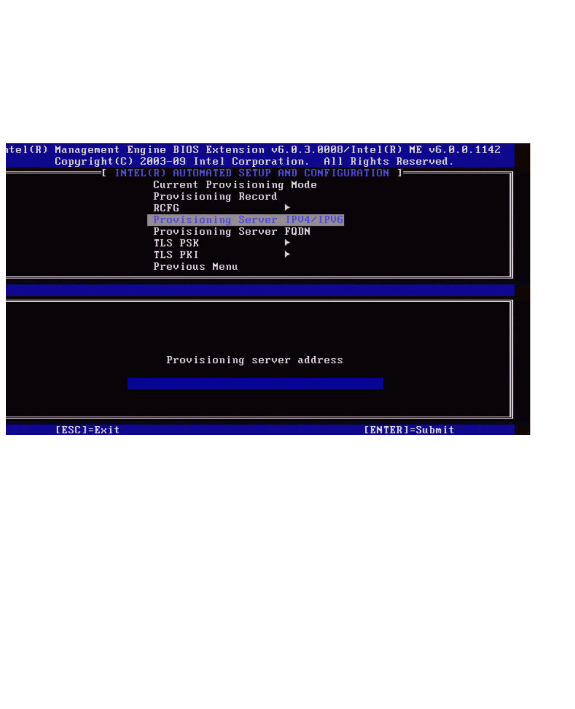 Under the Intel Automated Setup and Configuration menu, select Provisioning Server IPv4/IPv6 and press Enter.