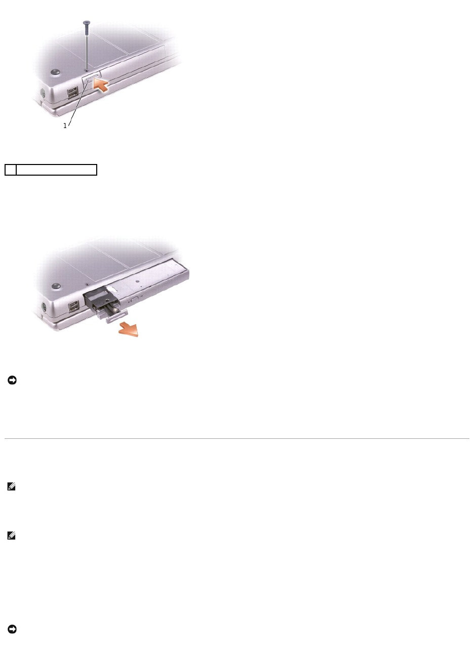 お使いのコンピュータには、出荷時にオプティカルドライブがモジュールベイに取り付けられています。 ただし、オプティカルドライブにデバイスネジは取り付けられていません。別に梱包されています。