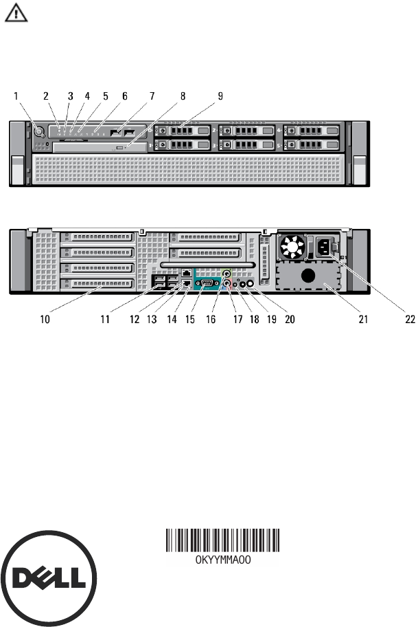 Dell Precision 워크스테이션 R7610 설치 및 기능 정보 경고 정보 경고: 경고는 재산상의 피해나 심각한 부상 또는 사망을 유발할 수 있는 위험 이 있음을 알려줍니다. 전면 및 후면 모습 그림 1 . 전면 모습 및 후면 모습 1. 2. 3. 4. 5. 전원 단추, 전원 표시등 시스템 식별 버튼 시스템 식별 표시등 드라이브 작동 표시등 네트워크 링크 무결성 표시등(2 개) 6. 진단 표시등(4 개) 7. USB 2.0 커넥터(2 개) 8. 광학 드라이브 9. 10. 11. 12. 13. 14. 15. 16. 하드 드라이브 베이(6 개) 확장 카드 슬롯 USB 2.