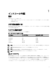 オペレーティングシステムのインストールと再インストール 注意: オペレーティングシステムのインストールまたはアップグレードを行う前に、システムのデータを すべてバックアップしてください。 お使いのシステムに Red Hat Enterprise Linux をインストールまたは再インストールするには、以下のいずれか の方法を使います。 • Dell Systems Management Tools and Documentation メディア • Red Hat インストールメディアによるカスタムインストール • Dell USC(Unified Server Configurator) Dell Systems Management Tools and Documentation メディアを使用したインストー ル Dell Systems Management Tools and Documentation メディアを使用して Red Hat Enterprise Linux 5 のインストー ルまたは再インストールを行うことをお勧めします。 Dell Systems Management To