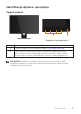 Identifikacija dijelova i upravljanja Pogled sprijeda 2 1 Regulatori na prednjoj ploči Oznaka Opis 1 Funkcijske tipke (više informacija potražite u Uporaba monitora) 2 Gumb za uključivanje/isključivanje (sa svjetlom stanja uključenosti) Stalno bijelo svijetlo označava da je monitor uključen i radi normalno. Trepćuće bijelo svjetlo označava da je monitor u stanju pripravnosti.