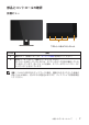 部品とコントロールの確認 前面ビュー 1 2 フロントパネルコントロール ラベル 説明 1 機能ボタン(詳細については、モニターの操作を参照してください) 2 電源オン / オフボタン(電源ステータスライト付き) 白いライトが点灯しているときには、モニターがオンで正常に機能している ことを示しています。白いライトの点滅は、モニターがスタンバイモードに 入っていることを示しています。 注意:ベゼルに光沢のあるディスプレイの場合、周囲の光やきらきらした表面の 光をベゼルが反射し、妨げになる可能性があります。ディスプレイの交換を検討 してください。 お使いのモニターについて | 7