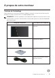À propos de votre moniteur Contenu de l'emballage Votre moniteur est livré avec les éléments indiqués ci-dessous. Assurez-vous d’avoir tous les éléments et utilisez Contacter Dell s’il manque quelque chose. REMARQUE : Certains composants sont optionnels et peuvent ne pas être fournis avec votre moniteur. Certaines fonctionnalités ou accessoires peuvent ne pas être disponibles dans certains pays.