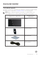 Acerca del monitor Contenido del paquete Su monitor se envía con los componentes que se muestran a continuación. Asegúrese de que ha recibido todos los componentes y Contactar con Dell en caso de que algo falte. NOTA: Algunos componentes pueden ser opcionales y no estarán incluidos con el monitor. Algunas funciones o medios pueden estar disponibles en ciertos países.