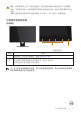 警告:如果电源线上有 3 针脚连接插头,请将电源线插头插到接地的 3 针脚插座。 例如,不要通过连接 2 针脚适配器来禁用电源线接地引脚。接地针脚是重要的安全 功能。 请确认建筑物内的配电系统应提供额定 120/240V,20A(最大)的断路器。 识别部件和控制按钮 前部概览 1 2 前面板控制 标签 说明 1 功能按钮(有关的详细信息,请参见操作显示器) 2 打开 / 关闭电源按钮(带电源状态灯) 白色指示灯稳定亮起表示显示器打开,并且正常运行。 闪烁白色表示显示器处于待机模式。 注:对于安有光滑边框的显示器,用户应考虑更换显示器,因为边框可能导致周围 光线和明亮表面产生干扰性反射。 关于您的显示器 | 7