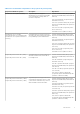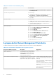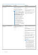 Tableau 22. Problèmes et solutions (suite) Problème Résolution L'alerte Dell OM : échec du calcul de l'intégrité du serveur et de ses composants s'affiche sous Surveillance Vues Alertes Dell EMC > Alertes du serveur Dell EMC sur la console. Associez manuellement le compte Fonctionnalité (sous licence) de surveillance d’identification pour surveiller le serveur Dell.